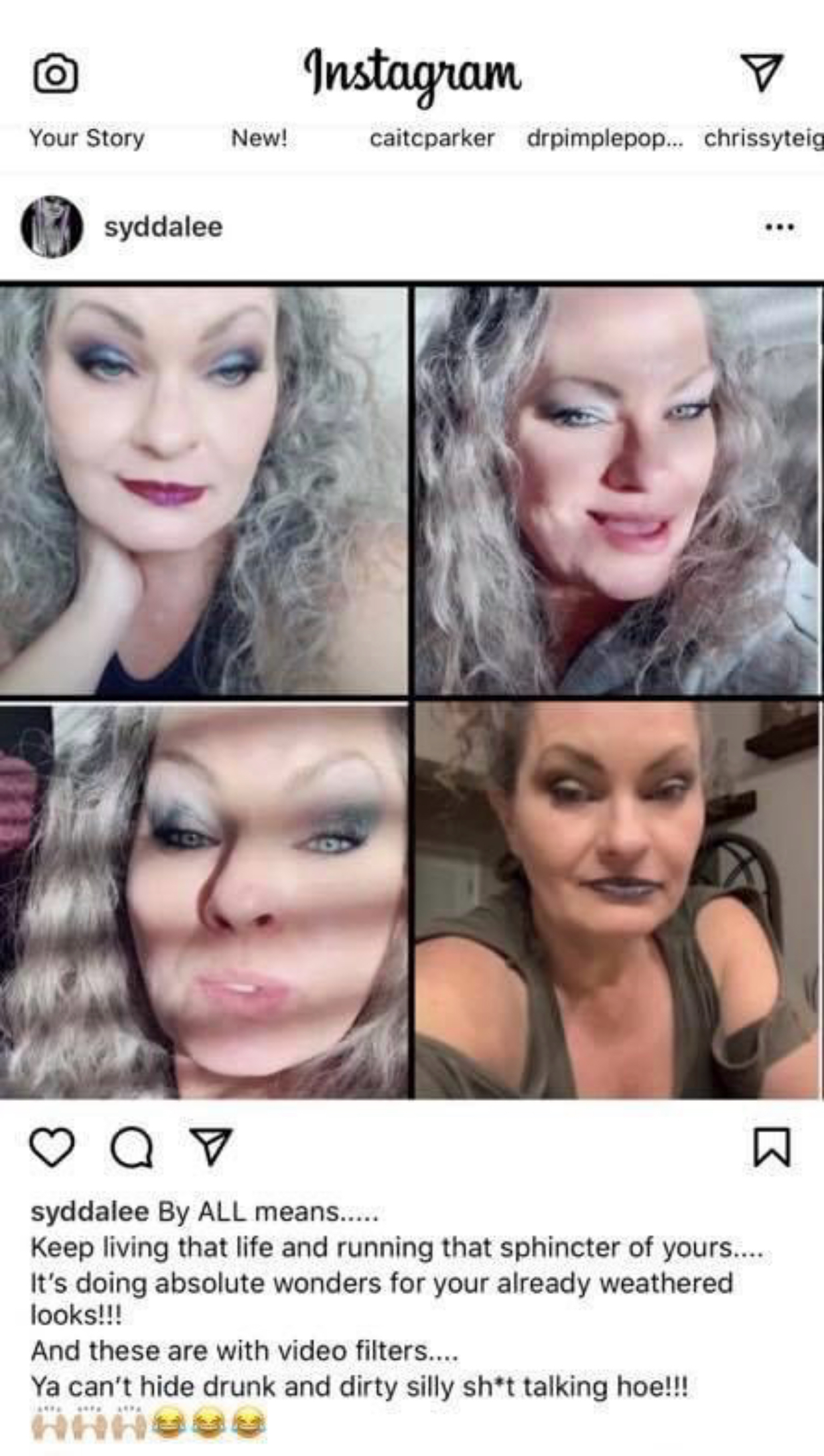 I was minding my business and posting vids across multiple platforms throughout September and October of 2020, as most COVID people were doing, so she did her famous “screen grab” on my videos dating from September 6 to October 27 — none of which were directed at her — and dedicated an IG post on the morning of October 28th entirely to me.